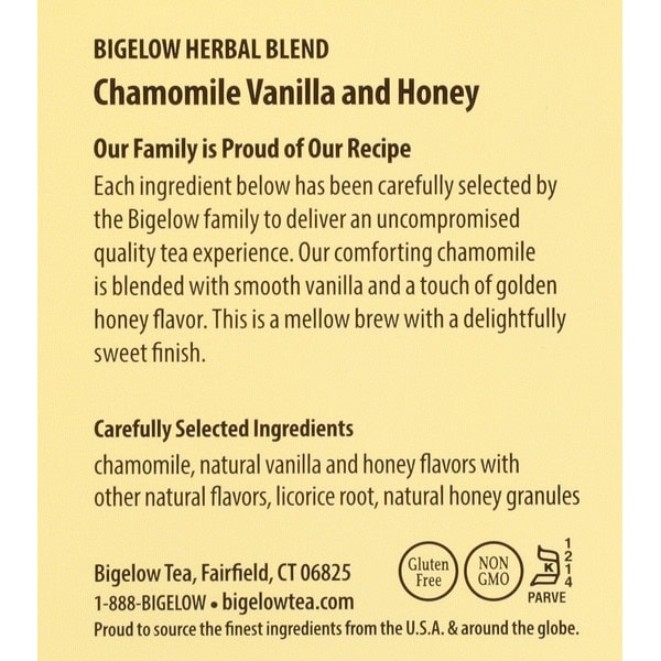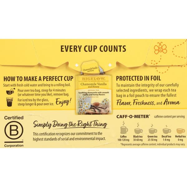 Family tea blenders since 1945. Settling Is Not An Option: Chamomile is an essential ingredient in this blend which is why only an exceptional flower will do. We use the whole flower which gives our tea an exquisitely sweet and delicate flavor. Our family continues to partner with the same dedicated growers for over 40 years because their fields produce some of the finest quality chamomile. Trust us, you can truly taste the difference. Every cup counts. Protected In Foil: To maintain the integrity of our carefully selected ingredients, we wrap each tea bag in a foil pouch to ensure the fullest flavor, freshness, and aroma. Our Family is Proud of Our Recipe: Each ingredient below has been carefully selected by the Bigelow family to deliver an uncompromised quality tea experience. Our comforting chamomile is blended with smooth vanilla and a touch of golden honey flavor. This is a mellow brew with a delightfully sweet finish. Certified B Corporation. Simply Doing the Right Thing: This certification recognizes our commitment to the highest standards of social and environmental impact.