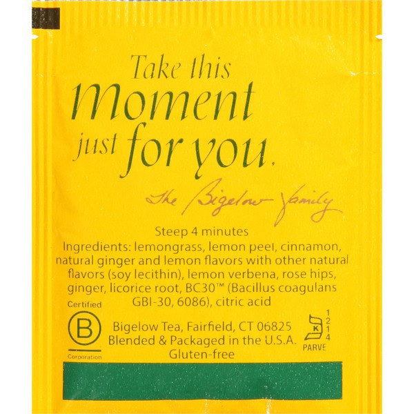 Family tea blenders since 1945. BC30 probiotic. Plus probiotics support healthy digestion. Tea bags individually wrapped in foil pouches. Freshness stays in. Air and moisture stay out. (hashtag)TeaProudly. Uncompromised quality. Our California lemons are second to none! That is why we continue to partner with the same American farmers since they started their groves in 1947-which is about the same time we began blending our tea. Their dedication to every detail produces the juiciest citrus year after year. We are fortunate these passionate growers harvest one of our most treasured ingredients. – The Bigelow family. Cindi Bigelow, President & CEO, 3rd Generation Visiting California Lemon Groves. Protected in foil to maintain the integrity of our carefully selected ingredients, we wrap each tea bag in a foil pouch to ensure the fullest flavor, freshness, and aroma. Our family is proud of our recipe. Each ingredient below has been carefully selected by the Bigelow family to deliver an uncompromised quality tea experience. Our most desired probiotic tea is a delicious blend of zesty lemon and ginger combined with BC30 probiotic that supports healthy digestion. Healthy never tasted so good! Simply doing the right thing. This certification recognizes our commitment to the highest standards of social and environmental impact. Proud to be: Zero-Landfill Company. Green-e. Made with 100% certified renewable energy. Our folding cartons are recyclable. Our tea bags are compostable. Certified B Corporation.