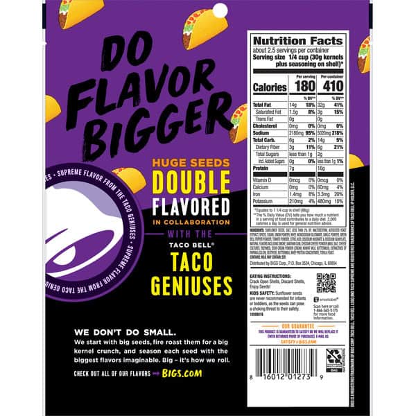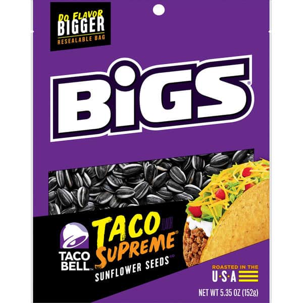 Taco Supreme is a Taco Bell fan favorite, and now you can enjoy the creamy, spicy taste you love — in BIGS Sunflower Seeds. These delicious seeds are perfect on the go, and provide a tasty snack that won’t fill you up. Satisfy your Taco Bell craving in between meals with a snack that tastes just like the real thing. Proudly grown in the USA with no artificial flavors or preservatives, these seeds come in a convenient 5.35-ounce resealable big bag for easy snacking. Why go small when you can go BIG?