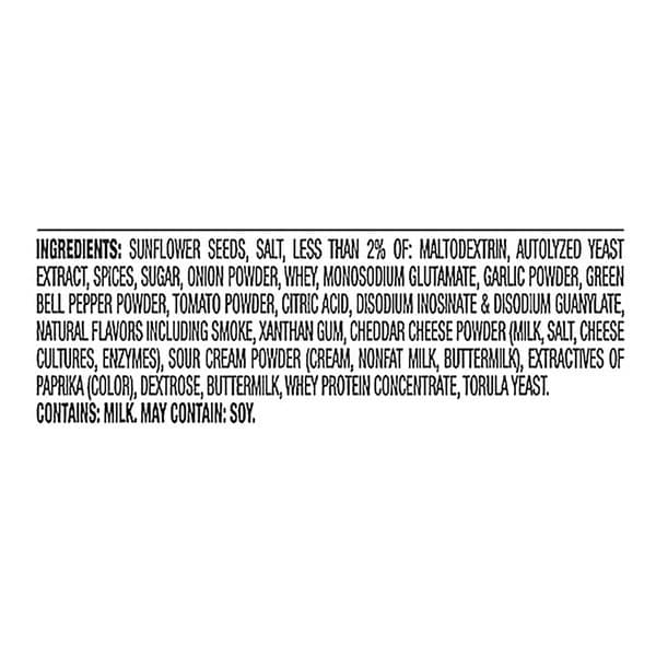 Sunflower Seeds, Salt, Less Than 2% Of: Maltodextrin, Autolyzed Yeast Extract, Spices, Sugar, Onion Powder, Whey, Monosodium Glutamate, Garlic Powder, Disodium Inosinate & Disodium Guanylate, Green Bell Pepper Powder, Tomato Powder, Citric Acid, Cheddar Cheese Powder (milk, Salt, Cheese Cultures, Enzymes), Sour Cream Powder (cream, Nonfat Milk, Buttermilk), Extractives Of Paprika (color), Xanthan Gum, Dextrose, Natural Flavors, Buttermilk, Whey Protein Concentrate, Torula Yeast, Natural Smoke Flavor.