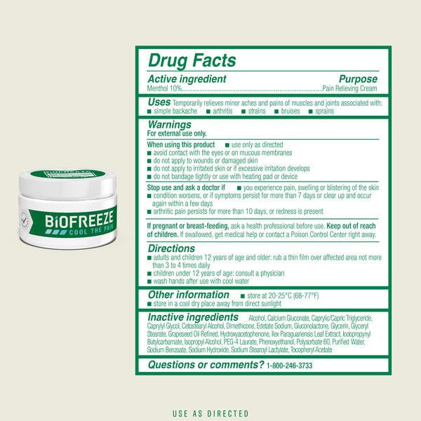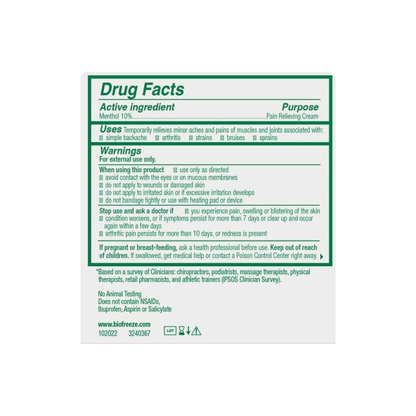 Clinically recommended Number 1. Cool the pain. Trusted by pharmacists, physical therapists, chiropractors, massage therapists and podiatrists. Cold therapy pain relief for sore. Muscles, backaches, sore joints and arthritis. Long-lasting. Deep penetrating. Natural moisturizers. Non-greasy. Paraben-Free. www.biofreeze.com. Questions or comments: 1-800-246-3733. Find one in your area at Biofreeze.com. No animal testing. Manufactured in the USA.