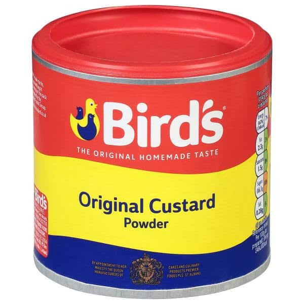 Store in a cool, dry place. Once made up, store in a refrigerator and treat as fresh food. How to Make Delicious Bird’s Custard: To make 1 pint (568 ml). On the Hob: 1. Put 2 tablespoons (35 g) of custard powder and 1-2 tablespoons (15 g – 35 g) of sugar in a basin. 2. Mix into a smooth paste with a little (approx. 2 tablespoons) milk taken from 1 pint (568 ml). 3. Heat the remaining milk to nearly boiling and pour onto the custard mix, stirring well. 4. Return to the saucepan and bring to the boil over a gentle heat, stirring continuously. In the Microwave (750W): 1. Follow steps 1 & 2 above. 2. Add the remaining milk and cook on full power for 6 minutes, stirring halfway through cooking period. 3. Leave to stand for 1 minute before serving. NB. All cooking appliances vary. These are guidelines only. Cooking time will differ for a lower or higher wattage microwave oven. Handy Hints: Bird’s custard powder can be made up with skimmed, semi-skimmed or full cream milk. The thickness of the custard can be varied by using a little more or less milk as you prefer. Sugar can be adjusted to suit your taste. For perfect Bird’s custard; Ensure you have a smooth paste; Add the hot milk to the custard paste; Stir continuously.