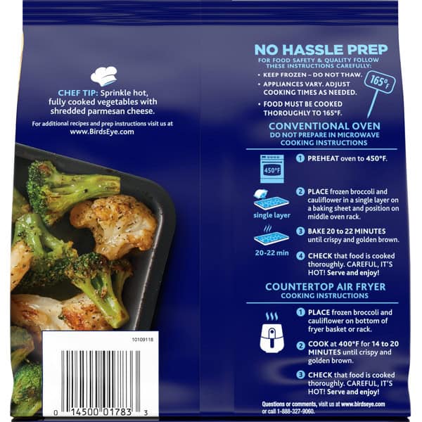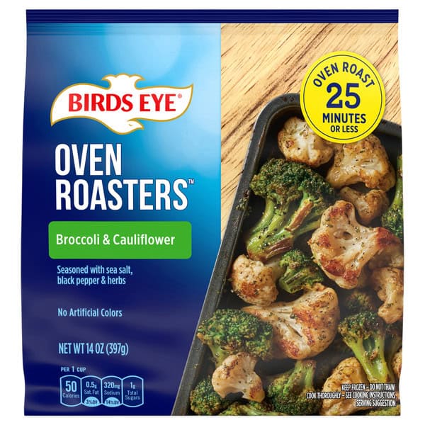 Enjoy savory roasted vegetables without the hassle when you have Birds Eye Oven Roasters, Seasoned Broccoli & Cauliflower. Birds Eye Oven Roasters make roasting vegetables easier than ever—no washing, chopping or seasoning required. Sea salt, black pepper and herbs create the perfect seasoning combination to complement the pieces of frozen broccoli and frozen cauliflower. These frozen mixed vegetables were specially selected and flash frozen, locking in fresh flavor and nutrients, to provide you and your family with high-quality frozen vegetables. These Birds Eye frozen sides are made with no artificial colors for a delicious and convenient way to enjoy vegetable sides without compromise. Serve the roasted vegetables as a side dish along with your favorite grilled meat, or add them to grain bowls, pasta dishes and salads as part of a main dish. Easily prepare the seasoned vegetables by placing them on a lightly greased baking sheet and roasting for about 25 minutes or until they are golden brown. Store this 14 ounce bag of frozen broccoli florets and cauliflower in the freezer to maintain freshness until you are ready to enjoy. It’s good to eat vegetables, so Birds Eye makes vegetables good to eat.