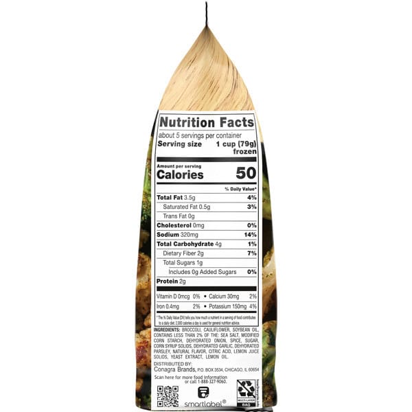 Conventional Oven: Do not prepare in microwave cooking instructions. 1. Preheat oven to 450 degrees F. 2. Place frozen broccoli and cauliflower in a single layer on a baking sheet and position on middle oven rack. 3. Bake 20 to 22 minutes until crispy and golden brown. 4. Check that food is cooked thoroughly. Careful, it’s Hot! Serve and enjoy! Countertop Air Fryer Cooking Instructions: 1. Place frozen broccoli and cauliflower on bottom of fryer basket or rack. 2. Cook at 400 degrees F for 14 to 20 minutes until crispy and golden brown. 3. Check that food is cooked thoroughly. Careful, it’s hot! Serve and enjoy! Cook thoroughly – See cooking instructions. No hassle prep. For food safety & quality follow these instructions carefully: keep frozen – do not thaw. Appliances vary. Adjust cooking time as needed. Food must be cooked thoroughly to 165 degrees F.