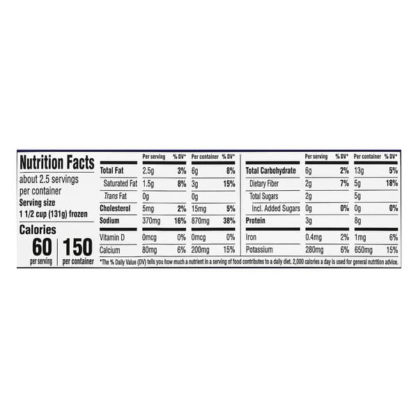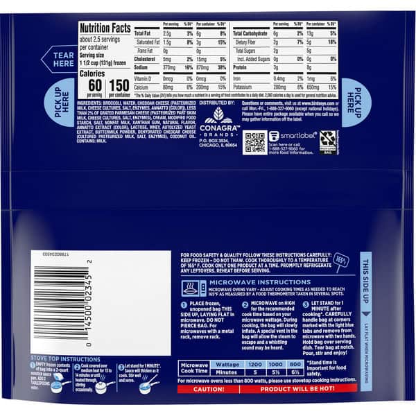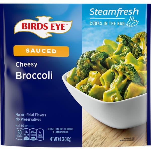 No artificial flavors. Per 1-1/2 Cup: 60 calories; 1.5 g sat fat (8% DV); 370 mg sodium (16% DV); 2 g total sugars. Steamfresh – Cooks in the bag! www.birdseye.com. how2recycle.info. Questions or comments, visit us at www.birdseye.com or call Mon-Fri, 1-888-327-9060 (except national holidays). Please have entire package available when you call so we may gather information off the label. how2recycle.info.