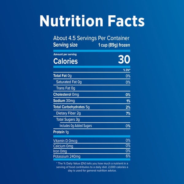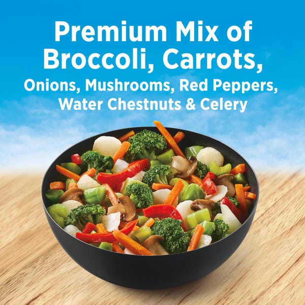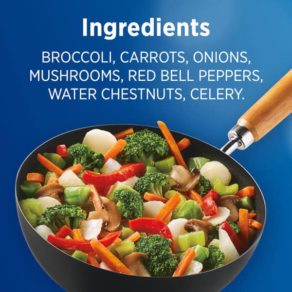 Whether you’re looking for a tasty side for dinner or a convenient recipe addition, Birds Eye Broccoli Stir-Fry Frozen Vegetable Mix is a delicious solution. This mix of cut vegetables has frozen broccoli, carrots, onions, mushrooms, red peppers, water chestnuts and celery. Birds Eye frozen vegetables make a great addition to many recipes, including meals that use Asian stir-fry vegetables. Each bag of broccoli stir-fry vegetables has 30 calories per serving and contains nothing artificial. Preparation of these frozen mixed vegetables is quick and easy on your stovetop and they can be cooked with a variety of spices and sauces to create delicious prepared meals. Make mealtime complete with Birds Eye Broccoli Stir-Fry.
