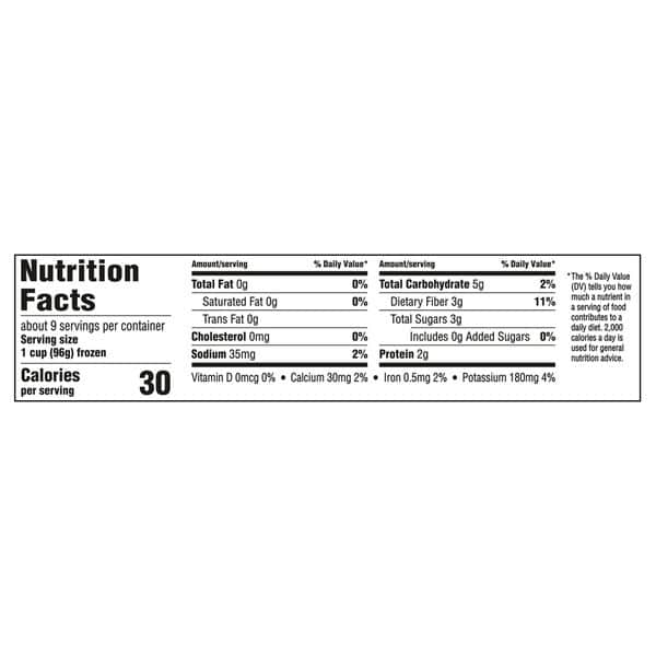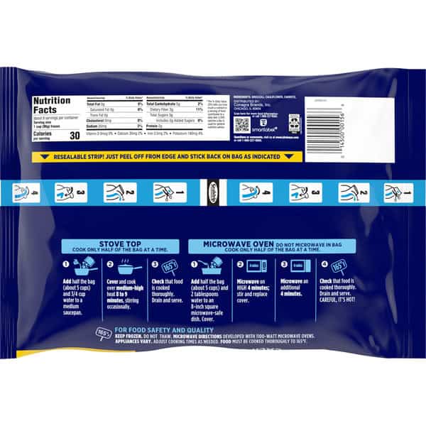 Stove Top: Cook only half of the bag at a time. 1. Add half the bag (about 5 cups) and 3/4 cup water to a medium saucepan. 2. Cover and cook over medium-high heat 8 to 9 minutes, stirring occasionally. 3. Check the food is cooked thoroughly. Drain and serve. Microwave Oven: Do not microwave in bag cook only half of the bag at a time. 1. Add half the bag (about 5 cups) and 2 tablespoons water to an 8-inch square microwave-safe dish. Cover. 2. Microwave on high 4 minutes; Stir and replace cover. 3. Microwave an additional 4 minutes. 4. Check that food is cooked thoroughly. Drain and serve. Careful, it’s hot! For Food Safety and Quality: Keep frozen. Do not thaw. Microwave directions developed with 1100-watt microwave ovens. Appliances vary. Adjust cooking times as needed. Food must becooked thoroughly to 165 degrees F.