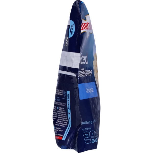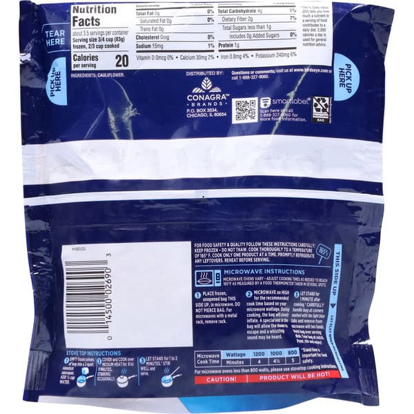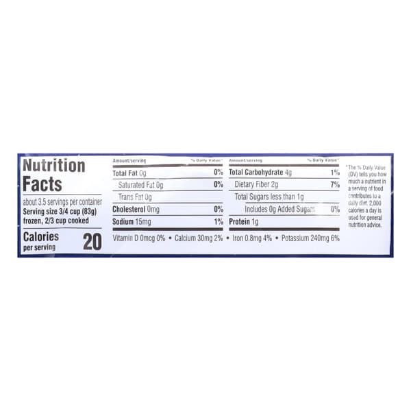 Per 3/4 Cup: 20 calories; 0 g sat fat (0% DV); 15 mg sodium (1% DV); less than 1 g total sugars. 4 g carbs per serving. Cooks in the bag. Nothing artificial. www.birdseye.com. how2recycle.info. SmartLabel: Scan or call 1-888-327-9060 for more food information. Questions or comments, visit us at www.birdseye.com or call 1-888-327-9060.