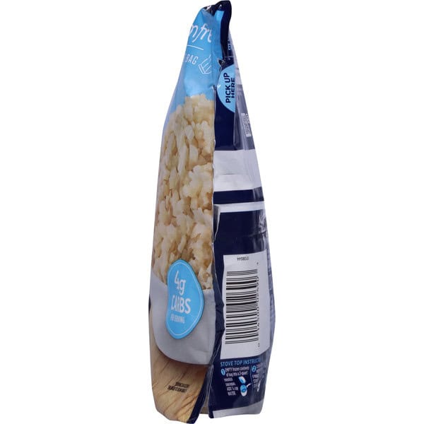 Microwave Instructions: Microwave ovens vary – adjust cooking times as needed to reach 165 degrees F as measured by a food thermometer taken in several spots. 1. Place frozen, unopened bag this side up, in microwave. Do not pierce bag. For microwaves with a metal rack, remove rack. 2. Microwave on high for the recommended cook time based on your microwave wattage. During cooking, the bag will slowly inflate. A special vent in the bag will allow the steam to escape and a whistling sound may be heard. 3. Let stand for 1 minute after cooking (Stand time is important for food safety). Carefully handle bag at corners marked with the light blue tabs and remove from microwave with two hands. Hold bag over serving dish. Tear bag at notch. Pour, stir and enjoy! Microwave Cook Time: Wattage 1200 – Minutes 4; Wattage 1000 – Minutes 4-1/2; Wattage 800 – Minutes 5. For microwave ovens less than 800 watts, please use stovetop cooking instructions. Stove Top Instructions:1. Empty frozen contents of bag into a 2-quart nonstick saucepan. Add 1/2 cup water. 2. Cover and cook over medium heat for 8 to 9 minutes, stirring occasionally. 3. Let stand for 1 to 2 minutes (Stand time is important for food safety). Stir well and serve. For food safety & quality follow these instructions carefully: Keep frozen – do not thaw. Cook thoroughly to a temperature of 165 degrees F. Cook only one product at a time. Promptly refrigerate any leftovers. Reheat before serving. Caution! Product will be hot!