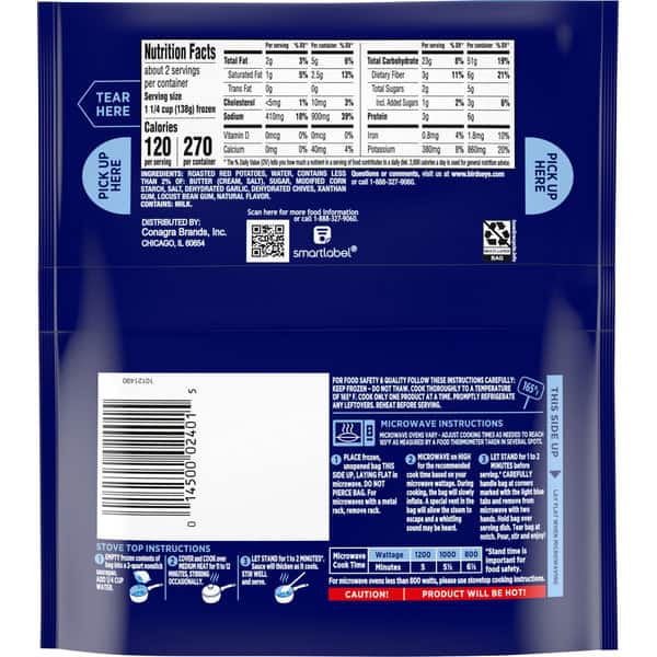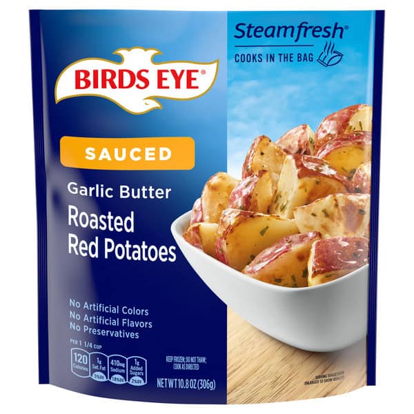Enjoy savory roasted vegetables without the hassle when you have Birds Eye Steamfresh Roasted Red Potatoes with Garlic Butter Sauce. Birds Eye Steamfresh makes vegetable sides easier than ever—no washing, chopping or seasoning required. Lightly sauced with garlic butter, these frozen potatoes offer a delicious side dish everyone will love. These roasted potatoes were specially selected and flash frozen, locking in fresh flavor and nutrients, to provide you and your family with high-quality frozen vegetables. This Birds Eye bag of steamable potatoes contains no artificial flavors or preservatives for a delicious and convenient way to enjoy frozen sides without compromise. Serve the frozen vegetable option as a side dish along with your favorite grilled meat instead of mashed potatoes, or add them to grain bowls, pasta dishes and salads as part of a main dish. Easily prepare the bag of potatoes in the microwave in under 7 minutes or on the stove for 11 to 12 minutes. Let stand for 1 to 2 minutes before serving. Store this 10.8 ounce bag of frozen vegetables in the freezer to maintain freshness until you are ready to enjoy. It’s good to eat vegetables, so Birds Eye makes vegetables good to eat.