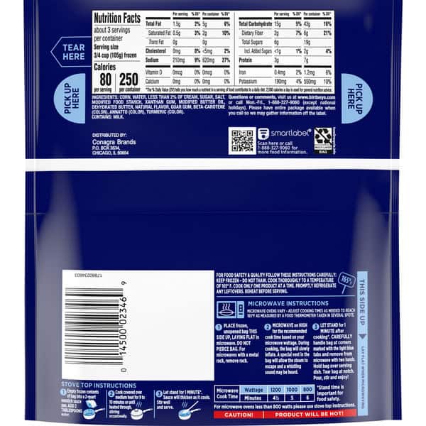 No artificial flavors. Per 3/4 Cup: 80 calories; 0.5 g sat. fat (3% DV); 210 mg sodium (9% DV); 6 g total sugars. Steamfresh. Cooks in the bag. how2recycle.info. SmartLabel. Scan or call 1-888-327-9060 for more food information. Questions or comments, visit us at www.birdeye.com or call Mon.-Fri., 1-888-327-9060 (except national holidays). Please have entire package available when you call so we may gather information off the label.