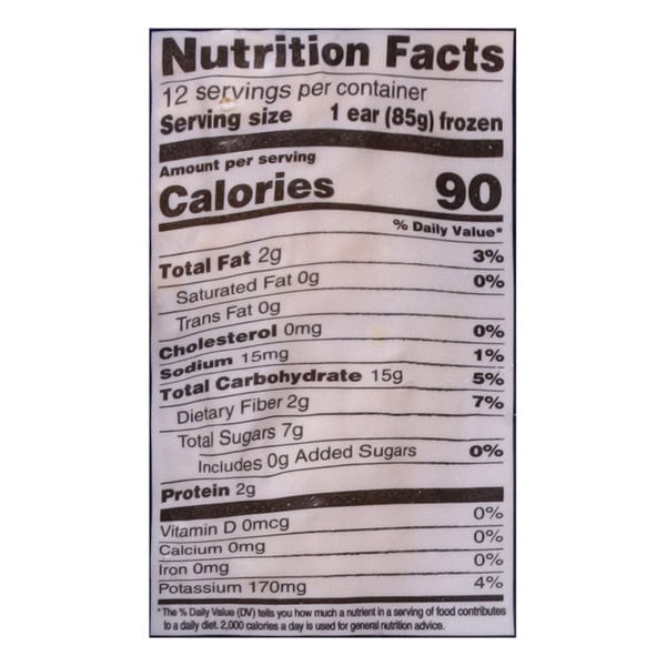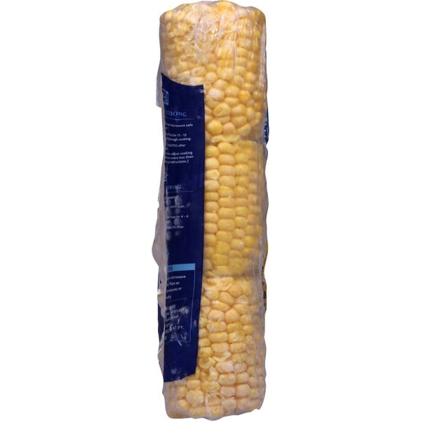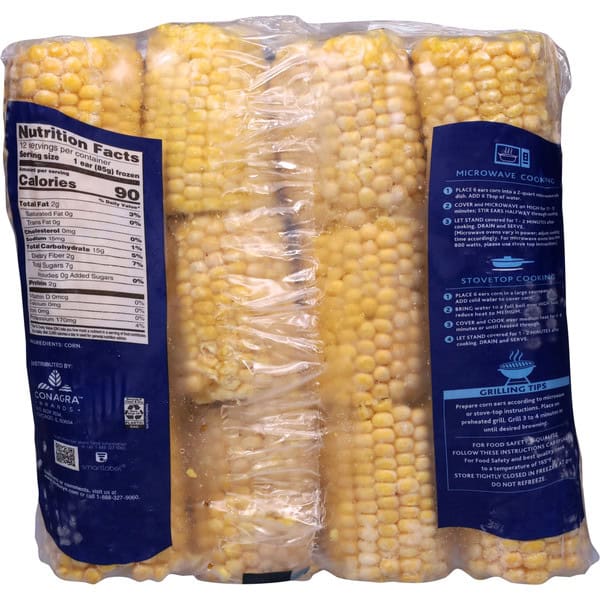 Cook thoroughly see cooking instructions. Microwave Cooking: 1. Place 6 ears corn into a 2 quart microwave safe dish. Add 6 tbsp of water. 2. Cover and microwave on high for 11 – 12 minutes; stir ears half way through cooking. 3. Let stand covered for 1-2 minutes after cooking. Drain and serve. (Microwave ovens vary on power; adjust cooking time accordingly. For microwave ovens less than 800 watts, please use stove top instructions). Stovetop Cooking: 1. Place 6 ears corn in a large saucepan. Add cold water to cover corn. 2. Bring water to a full boil over high heat, reduce heat to medium. 3. Cover and cook over medium heat for 4-6 minutes or until heated through. 4. Let stand covered for 1-2 minutes after cooking. Drain and serve. Grilling Tips: Prepare corn ears according to microwave or stove – top instructions. Place on preheated grill. Grill 3 to 4 minutes or until desired browning. For food safety quality follow these instructions carefully. For food safety and best quality cook to a temperature of 165 degrees F. Store tightly closed in freezer at 0 degrees F. Do not refreeze.