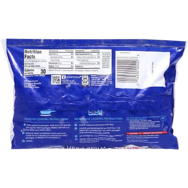 Cook thoroughly – See cooking instructions. Stovetop Cooking Instructions: 1. Place onions in saucepan. Add 3/4 cup water. (1/4 cup for half package). Bring water to a full boil over high heat. 2. Reduce heat to medium-high and cover. Cook for 6-7 minutes (4-5 minutes for half package), stirring occasionally. 3. Drain. Microwave Cooking Instructions: 1. Place onions in microwave safe dish. 2. Cover and microwave on high for 7 1/2 minutes (Per 1200 watt microwave) (4 minutes (Per 1200 watt microwave) for half package); stir halfway through cooking. 3. Let stand for 1 to 2 minutes after cooking (Stand time is important for food safety). 4. Drain. (Cook time based on 1200 watt microwave: cook time may need to be adjusted for your microwave.) For microwave ovens less than 800 watts, please use stovetop cooking instructions. For food safety & quality follow these instructions carefully: Keep frozen – do not thaw. Cook thoroughly to a temperature of 165 degrees F as measured by a food. Thermometer taken in several spots. Promptly refrigerate any leftovers. Reheat before serving. Caution! Product will be hot!