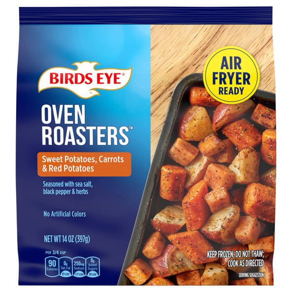 Enjoy savory roasted vegetables without the hassle when you have Birds Eye Oven Roasters, Seasoned Sweet Potatoes, Carrots & Red Potatoes. Birds Eye Oven Roasters make roasting vegetables easier than ever—no washing, chopping or seasoning required. Sea salt, black pepper and herbs create the perfect seasoning combination to complement the pieces of frozen sweet and red potatoes and frozen carrots. These frozen mixed vegetables were specially selected and flash frozen, locking in fresh flavor and nutrients, to provide you and your family with high-quality frozen vegetables. These Birds Eye frozen sides are made with no artificial colors for a delicious and convenient way to enjoy vegetable sides without compromise. Serve the roasted vegetables as a side dish along with your favorite grilled meat, or add them to grain bowls, pasta dishes and salads as part of a main dish. Easily prepare the seasoned vegetables by placing them on a lightly greased baking sheet and roasting for about 25 minutes or until they are golden brown. Store this 14 ounce bag of frozen potatoes and carrots in the freezer to maintain freshness until you are ready to enjoy. It’s good to eat vegetables, so Birds Eye makes vegetables good to eat.