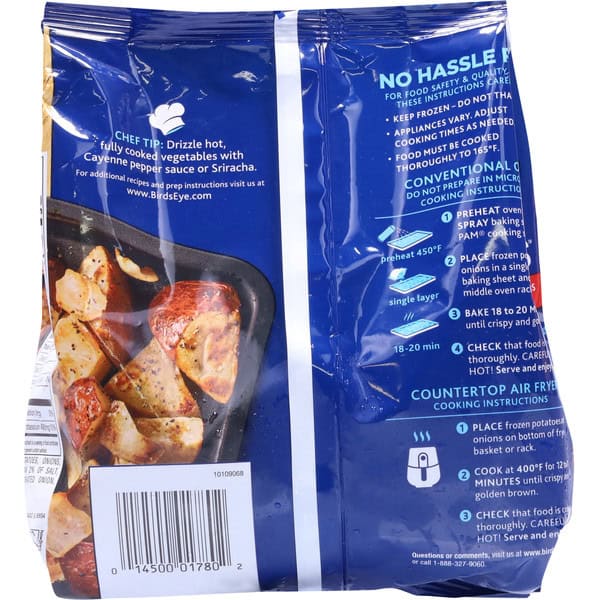 Cook thoroughly – See cooking instructions. Conventional Oven: Do not prepare in microwave cooking instructions. 1. Preheat oven to 450 degrees F. spray baking sheet with pam cooking spray. 2. Place frozen potatoes and onions in a single layer on the baking sheet and position on middle oven rack. 3. Bake 18 to 20 minutes until crispy and golden brown. 4. Check that food is cooked thoroughly. Careful, it’s hot. Serve and enjoy. Countertop Air Fryer cooking instructions: 1. Place frozen potatoes and onions on bottom of fryer basket or rack. 2. Cook at 400 degrees F for 12 to 14 minutes until crispy and golden brown. 3. Check that food is cooked thoroughly. Careful. It’s hot. Serve and enjoy. For Food Safety & Quality: Follow these instructions carefully. Keep frozen – Do not thaw. Appliances vary. Adjust cooking times as needed. Food must be cooked thoroughly to 165 degrees F.