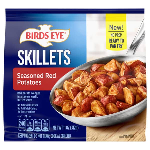 Enjoy savory pan fried vegetables without the hassle with Birds Eye Skillets Seasoned Red Potatoes. This delicious frozen side features specially selected and flash frozen red potato wedges tossed in a savory garlic butter sauce. Birds Eye Skillets make preparing a vegetables side dish easier than ever with no washing, chopping or seasoning required. Just add your frozen vegetables to a large skillet and pan fry until thoroughly cooked for a perfect potato side dish with no artificial flavors or colors and no preservatives. Store this 11 oz. bag of frozen potatoes in the freezer to maintain freshness until you are ready to enjoy as a side dish with favorite easy meals. Make mealtime complete with Birds Eye frozen vegetables.