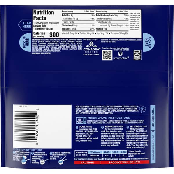Enjoy savory pasta sides without the hassle when you have Birds Eye Steamfresh Rotini and Vegetables. Garlic butter sauce complements the Rotini, broccoli, carrots and corn for a delicious side dish everyone will love. The mixed vegetables in this frozen side were specially selected and flash frozen, locking in fresh flavor and nutrients to provide you and your family with high-quality frozen vegetables. This Birds Eye pasta side is made with no artificial flavors or preservatives for a delicious and convenient way to enjoy frozen sides without compromise. Serve the steamed vegetables and pasta as a side dish or add chicken, sausage or ground beef to the pasta to make it a main dish. Easily prepare the frozen side in the microwave in under 6 minutes or under 11 minutes on the stove. Let stand for 1 minute before serving. Store this 11 ounce bag of frozen vegetables and pasta in the freezer to maintain freshness until you are ready to enjoy. It’s good to eat vegetables, so Birds Eye makes vegetables good to eat.