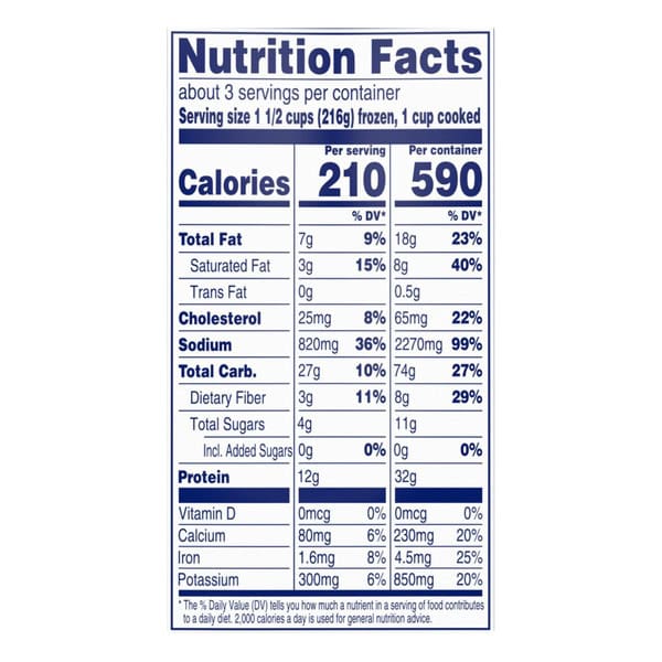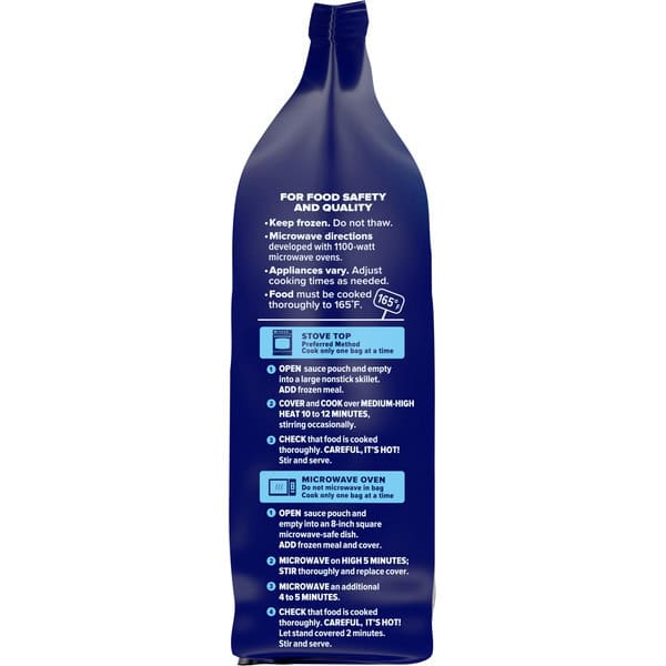 Stove Top (Preferred Method): Cook only one bag at a time. 1. Open sauce pouch and empty into a large nonstick skillet. Add frozen meal. 2. Cover and cook over medium-high heat 10 to 12 minutes, stirring occasionally. 3. Check that food is cooked thoroughly. Careful, it’s hot! Stir and serve. Microwave Oven: Do not microwave in bag. Cook only one bag at a time. 1. Open sauce pouch and empty into an 8-inch square microwave-safe dish. Add frozen meal and cover. 2. Microwave on high 5 minutes; stir thoroughly and replace cover. 3. Microwave an additional 4 to 5 minutes 4. Check that food is cooked thoroughly. Careful, it’s hot! Let stand covered 2 minutes. Stir and serve. For Food Safety and Quality: Keep frozen. Do not thaw. Microwave directions developed with 1100-watt microwave ovens. Appliances vary. Adjust cooking times as needed. Food must be cooked thoroughly to 165 degrees F.