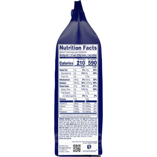 Vegetables (carrots, Broccoli, Peas), Sauce (water, Parmesan Cheese [pasteurized Part Skim Milk, Cheese Cultures, Salt, Enzymes], Cream, Nonfat Milk, Modified Corn Starch, Soybean Oil, Butter [cream, Salt], Salt, Garlic Powder, Black Pepper), Cooked Enriched Pasta (water, Enriched Wheat Flour [durum Wheat Semolina, Niacin, Reduced Iron, Thiamine Mononitrate, Riboflavin, Folic Acid]), Cooked White Meat Chicken (chicken Breast Meat With Rib Meat, Water, Isolated Soy Protein, Seasoning [sugar, Garlic, Romano Cheese (part Skim Cow’s Milk, Cheese Culture, Salt, Enzymes), Dehydrated Onion], Salt, Sodium Phosphates, Natural Flavor Coated With Corn Flour, Enriched Wheat Flour [wheat Flour, Niacin, Reduced Iron, Thiamine Mononitrate Riboflavin, Folic Acid], Salt, Corn Starch, Spices, Paprika, Maltodextrin, Caramel Color, Garlic Powder, Extractives Of Paprika)