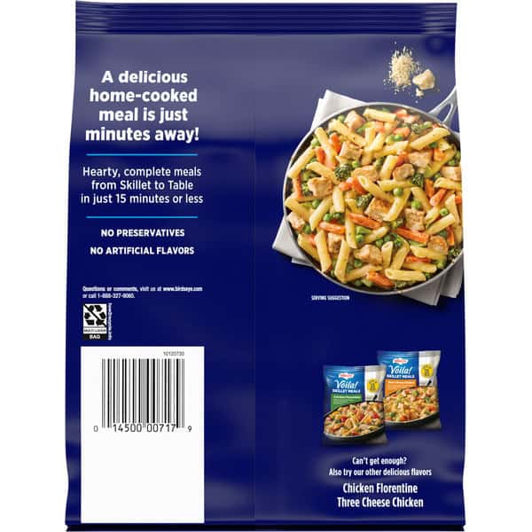 Serve up a delicious meal in minutes with Birds Eye Voila! Alfredo Chicken. With premium Birds Eye vegetables, quality meat and chef-inspired sauces in every bag, Birds Eye Voila! offers complete frozen meals for quick weeknight dinners the whole family will love. This delicious chicken pasta frozen dinner combines white meat chicken, pasta, broccoli, carrots, and peas in a creamy Alfredo sauce for a flavorful meal you can make any night of the week. This Birds Eye pasta dinner with mixed vegetables is made with no artificial flavors and no preservatives for a quick and convenient family dinner solution without compromise. Easily prepare frozen family meals in about 12 minutes on the stove-top or in the microwave. For stove-top preparation, pour sauce pouch and contents of the bag into a skillet with water, stir and simmer until heated through according to package instructions. For even faster preparation, microwave the chicken Alfredo pasta frozen meal according to the package instructions. Store this 21 ounce bag in the freezer to maintain freshness until you are ready to prepare frozen family dinners. It’s good to eat vegetables, so Birds Eye makes vegetables good to eat.