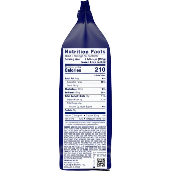 Sauce (water, Ranch Seasoning [maltodextrin, Salt, Autolyzed Yeast Extract, Cultured Buttermilk, Garlic Powder, Onion Powder, Modified Food Starch, Spices, Citric Acid, Xanthan Gum, Less Than 2% Of: Natural Flavor, Lactic Acid], Cheddar Cheese [pasteurized Milk, Cheese Cultures, Salt, Enzymes, Annatto {color}], Cheese Powder [whey, Cheddar Cheese {pasteurized Milk, Cheese Culture, Salt, Enzymes}, Butter, Buttermilk Solids, Sodium Phosphate, Natural Flavor, Enzyme Modified Cheese {cheddar Cheese (pasteurized Milk, Cheese Culture, Salt, Enzymes), Sodium Phosphate, Enzymes, Xanthan Gum}], Cream, Skim Milk, Contains Less Than 2% Of: Modified Corn Starch, Nonfat Dry Milk, Salt, Cheddar Cheese Flavor [cheddar Cheese {cultured Milk, Salt, Enzymes}, Natural Flavor, Water, Whey, Blue Cheese {cultured Milk, Salt, Enzymes}, Disodium Phosphate, Salt], Garlic Powder, Xanthan Gum, Annatto Extract [color]), Cooked Enriched Pasta (water, Enriched Wheat Flour [durum Wheat Semolina, Niacin, Ferrous Sulfate {iron}, Thiamine Mononitrate, Riboflavin, Folic Acid]), Vegetables (broccoli, Carrots, Corn), Cooked Chicken (white Meat Chicken, Water, Olive Oil, Contains 2% Or Less Of: Isolated Soy Protein Product [isolated Soy Protein, Modified Potato Starch, Corn Starch, Carrageenan, Soy Lecithin], Dextrose, Potassium Chloride, Salt, Sodium Phosphates, Flavoring).
