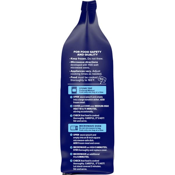 For Food Safety and Quality: Keep frozen. Do not thaw. Microwave directions developed with 1100-watt microwave ovens. Appliances vary. Adjust cooking times as needed. Food must be cooked thoroughly to 165 degrees F. Stove Top: Preferred method. Cook only one bag at a time. 1. Open sauce pouch and empty into a large nonstick skillet. Add frozen meal. 2. Cover and cook over medium-high heat 10 to 11 minutes, stirring occasionally. 3. Check that food is cooked thoroughly. Careful, it’s hot! Stir and serve. Microwave Oven: Do not microwave in bag. Cook only one bag at a time. 1. Open sauce pouch and empty into an 8-inch square microwave-safe dish. Add frozen meal and cover. 2. Microwave on high 5 minutes; stir thoroughly and replace cover. 3. Microwave an additional 4 to 6 minutes. 4. Check that food is cooked thoroughly. Careful, it’s hot! Let stand covered 2 minutes. Stir and serve. Cook as directed.