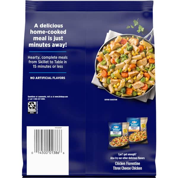 Serve up a delicious meal in minutes with Birds Eye Voila! Cheesy Ranch Chicken. With premium Birds Eye vegetables, quality meat and chef-inspired sauces in every bag, Birds Eye Voila! offers complete frozen meals for quick weeknight dinners the whole family will love. This delicious chicken pasta frozen dinner combines white meat chicken, pasta, broccoli, carrots, and corn in a creamy ranch and cheddar cheese sauce for a flavorful meal you can make any night of the week. This Birds Eye pasta dinner with mixed vegetables is made with no artificial flavors for a quick and convenient family dinner solution without compromise. Easily prepare frozen family meals in about 20 minutes on the stove-top or in the microwave. For stove-top preparation, pour sauce pouch and contents of the bag into a skillet with water, stir and simmer until heated through according to package instructions. For even faster preparation, microwave the cheesy ranch chicken frozen meal according to the package instructions. Store this 21 ounce bag in the freezer to maintain freshness until you are ready to prepare frozen family dinners. It’s good to eat vegetables, so Birds Eye makes vegetables good to eat.