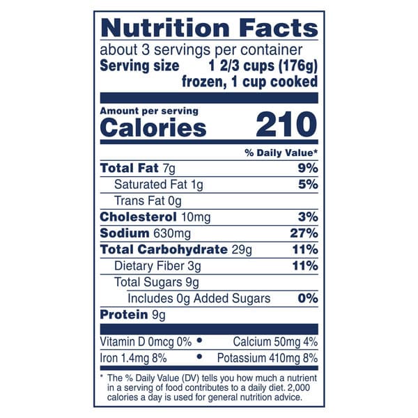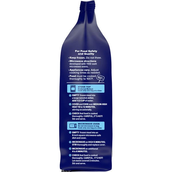 Stove Top: Preferred method. Cook only one bag at a time. 1. Empty frozen meal into a large nonstick skillet. Add 1/2 cup of water. 2. Cover and cook over medium-high heat 10 to 12 minutes, stirring occasionally. 3. Check that food is cooked thoroughly. Careful, it’s hot! Stir and serve. Microwave Oven: Do not microwave in bag. Cook only one bag at a time. 1. Empty frozen meal into an 8-inch square microwave-safe dish and cover. 2. Microwave on high 5 minutes; stir thoroughly and replace cover. 3. Microwave an additional 4 to 6 minutes. 4. Check that food is cooked thoroughly. Careful, it’s hot! Let stand covered 2 minutes. Stir and serve. Cook as directed. For Food Safety and Quality: Keep frozen. Do not thaw. Microwave directions developed with 1100-watt microwave ovens. Appliances vary. Adjust cooking times as needed. Food must be cooked thoroughly to 165 degrees F.