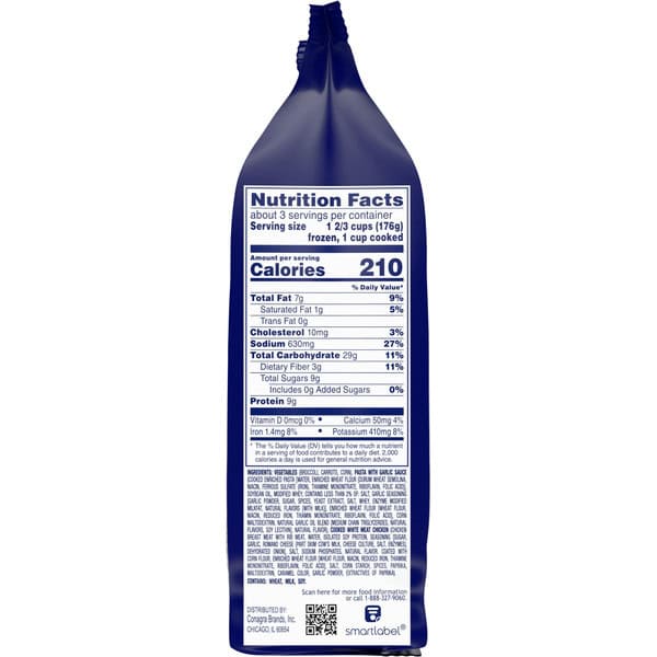 Vegetables (broccoli, Carrots, Corn), Pasta With Garlic Sauce (cooked Enriched Pasta [water, Enriched Wheat Flour {durum Wheat Semolina, Niacin, Ferrous Sulfate (iron), Thiamine Mononitrate, Riboflavin, Folic Acid}], Soybean Oil, Modified Whey, Contains Less Than 2% Of: Salt, Garlic Seasoning [garlic Powder, Sugar, Spices, Yeast Extract, Salt, Whey, Enzyme Modified Milkfat, Natural Flavors {with Milk}], Enriched Wheat Flour [wheat Flour, Niacin, Reduced Iron, Thiamin Mononitrate, Riboflavin, Folic Acid], Corn Maltodextrin, Natural Garlic Oil Blend [medium Chain Triglycerides, Natural Flavors, Soy Lecithin], Natural Flavor), Cooked White Meat Chicken (chicken Breast Meat With Rib Meat, Water, Isolated Soy Protein, Seasoning [sugar, Garlic, Romano Cheese {part Skim Cow’s Milk, Cheese Culture, Salt, Enzymes}, Dehydrated Onion], Salt, Sodium Phosphates, Natural Flavor, Coated With Corn Flour, Enriched Wheat Flour [wheat Flour, Niacin, Reduced Iron, Thiamine Mononitrate, Riboflavin, Folic Acid], Salt, Corn Starch, Spices, Paprika, Maltodextrin, Caramel Color, Garlic Powder, Extractives Of Paprika)