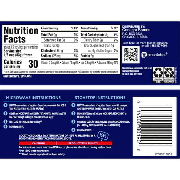 Whether you’re looking for a tasty side dish or convenient recipe ingredients, Birds Eye Chopped Spinach Frozen Vegetables are a delicious solution. Get creative preparing these versatile chopped spinach leaves by adding them to your favorite smoothie blend for a delicious breakfast or use them to add an extra layer of flavor and color to prepared meals. These frozen veggies contain 30 calories per serving and have nothing artificial. The best part is that preparation of frozen spinach is quick and easy. These microwavable vegetables can be steamed in a microwave-safe dish or prepared on your stovetop. Make mealtime complete by adding Birds Eye frozen vegetable options to your recipes.