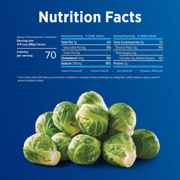 Enjoy savory vegetables without the hassle when you have Birds Eye Steamfresh Sea Salt & Cracked Pepper Brussels Sprouts. Brussels sprouts with sea salt and pepper make it easy for everyone to love their vegetables. These frozen brussels sprouts were specially selected and flash frozen, locking in fresh flavor and nutrients, to provide you and your family with high-quality frozen vegetables. This Birds Eye frozen veggies side is made with no artificial flavors, colors or preservatives for a delicious and convenient way to enjoy vegetable dishes and frozen sides without compromise. Serve the steamed vegetables as a side dish along with your favorite grilled meat, or add them to grain bowls, pasta dishes and salads as part of a main dish. Easily prepare the frozen vegetable side dishes by microwaving them in the bag for up to 6 minutes or by cooking on the stovetop for 9 to 10 minutes. Let stand for 1 to 2 minutes before serving. Store this 10 ounce bag of steamable seasoned vegetables in the freezer to maintain freshness until you are ready to enjoy. It’s good to eat vegetables, so Birds Eye makes vegetables good to eat.