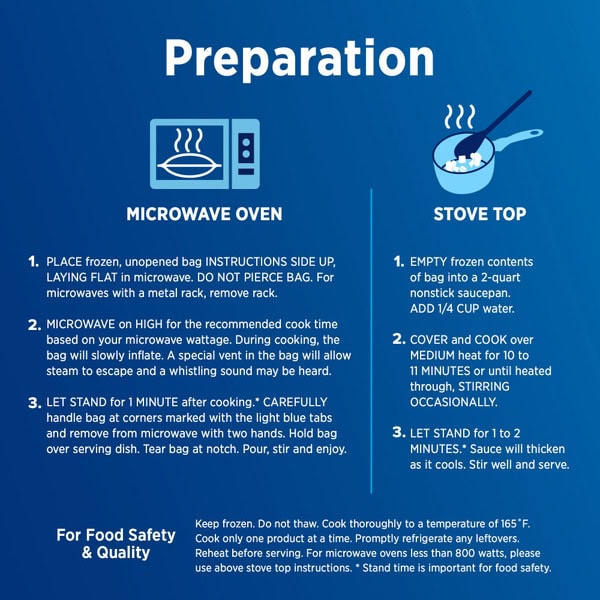 Microwave Instructions: Microwave ovens vary – adjust cooking times as needed to reach 165 degrees F as measured by a food thermometer taken in several spots. (1) Place frozen, unopened bag this side up, laying flat in microwave. Do not pierce bag. For microwaves with a metal rack, remove rack. (2) Microwave on high for the recommended cook time based on your microwave wattage. During cooking, the bag will slowly inflate. A special vent in the bag will allow the steam to escape and a whistling sound may be heard. (3) Let stand for 1 minute after cooking (stand time is important for food safety). Carefully handle bag at corners marked with the light blue tabs and remove from microwave with two hands. Hold bag over serving dish. Tear bag at notch. Pour, stir and enjoy! Microwave Cook Time: 1200 wattage; 5 1/2 minutes. 1000 wattage; 6 minutes. 800 wattage; 7 minutes. For microwave ovens less than 800 watts, please use stovetop cooking instructions. Caution! Product will be hot! Unspecified Stove Top Instructions: (1) Empty frozen contents of bag into a 2-quart nonstick sauce pan. Add 1/4 cup water. (2) Cook covered over medium heat for 10 to 11 minutes or until heated through, stirring occasionally. (3) Let stand for 1 to 2 minutes (stand time is important for food safety). Sauce will thicken as it cools. Sitr well and serve. Cook thoroughly. See cooking instructions. For Food Safety & Quality Follow these Instructions Carefully: Keep frozen – do not thaw. Cook thoroughly to a temperature of 165 degrees F. Cook only one product at a time. Promptly refrigerate any leftovers. Reheat before serving.
