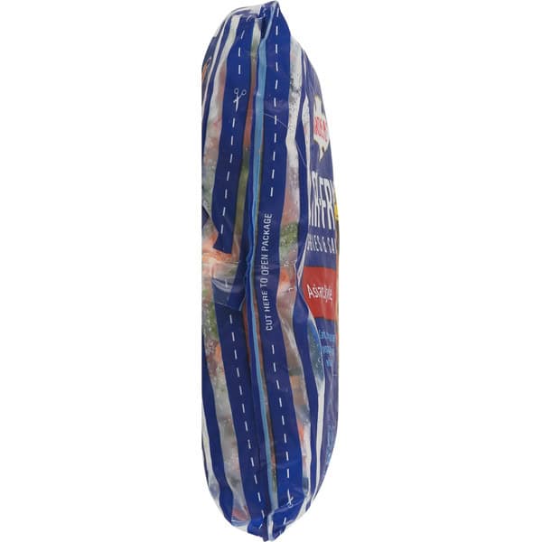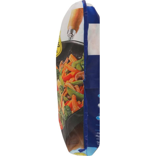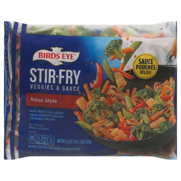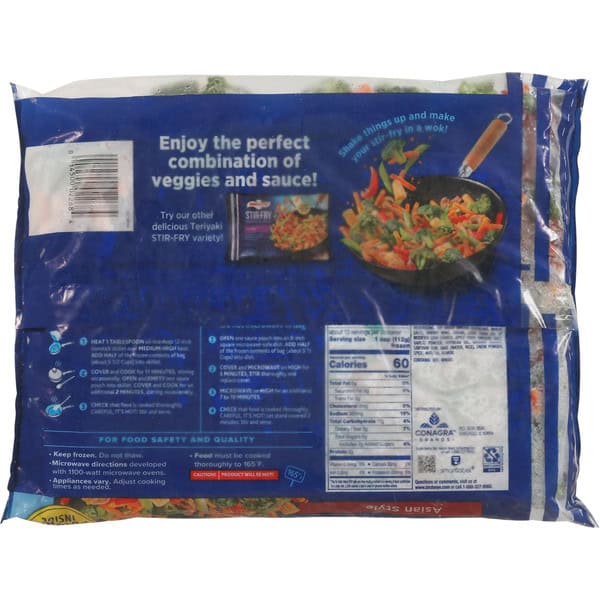 Stove Top-Half Bag. Prefered Method: 1. Heat 1 tablespoon oil in a deep 12-inch nonstick skillet over medium-high heat. Add half of the frozen contents of bag (about 5-1/2 Cups) into skillet. 2. Cover and cook for 11 minutes, stirring occasionally. Open and empty one sauce pouch into skillet. Cover and cook for an additional 2 minutes, stirring occasionally. 3. Check that food is cooked thoroughly. Careful, it’s hot! Stir and serve. Microwave Oven – Half Bag. Do not microwave in bag. 1. Open one sauce pouch into an 8-inch square microwave-safe dish. Add half of the frozen contents of bag (about 5 1/2 Cups) into dish. 2. Cover and microwave on high for 5 minutes; Stir thoroughly and replace cover. 3. Microwave on high for an additional 7 to 10 minutes. 4. Check that food is cooked thoroughly. Careful, it’s hot! Let stand covered 2 minutes. Stir and serve. Cook thoroughly – see cooking instructions. For food safety & quality. keep frozen-do not thaw. Microwave directions developed with 1100-watt microwave ovens. Appliances vary. Adjust cooking times as needed. Food must be cooked thoroughly to 165 degrees F. Caution! Product will be hot!