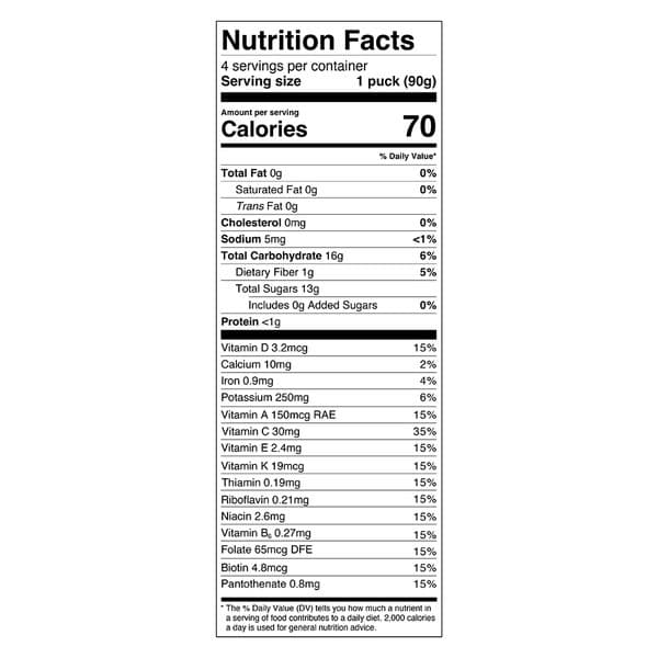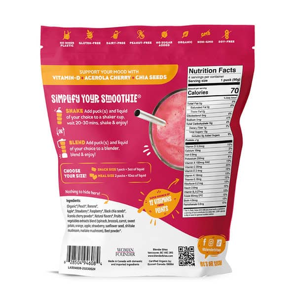 Simplify your smoothie: Shake: Add puck(s) and liquid of your choice to a shaker cup, wait 20-30 mins, shake & enjoy! Or Blend: Add puck(s) and liquid of your choice to a blender, blend & enjoy! Choose you size! Snack size: 1 puck + 5 oz of liquid. Meal size: 2 pucks + 10 oz of liquid.