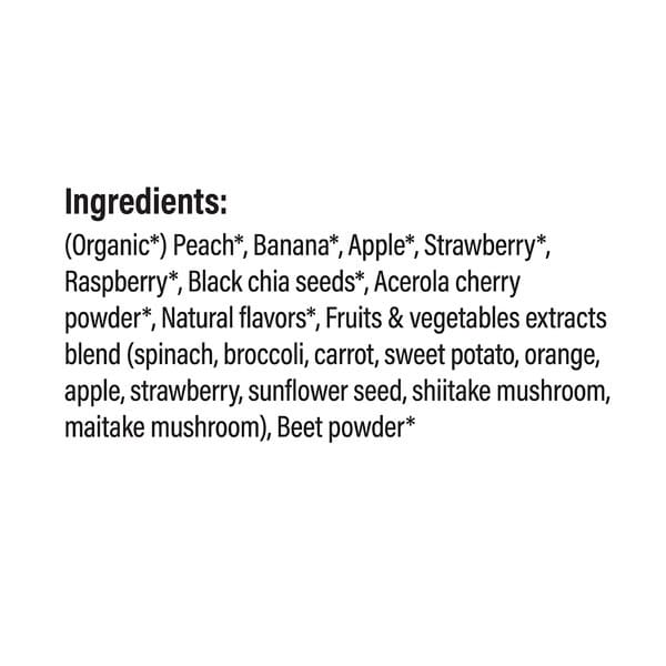 Peach*, Banana*, Apple*, Strawberry*, Raspberry*, Black chia seed*, Acerola powder*, Fruits & Vegetables extracts blend (spinach, broccoli, carrot, sweet potato, orange, apple, strawberry, sunflower seed, shiitake mushroom, maitake mushroom), Beet powder*, Natural flavors*.