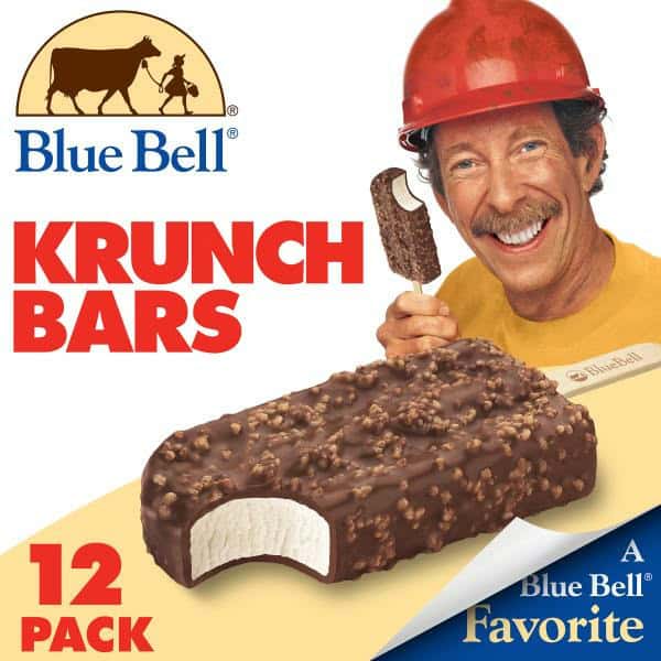 Blue Bell Krunch Bars are vanilla frozen dessert bars coated in milk chocolate and crisped rice.