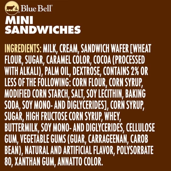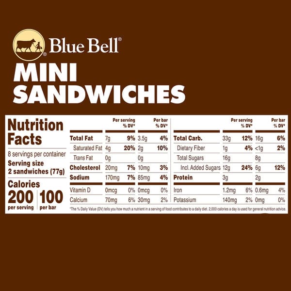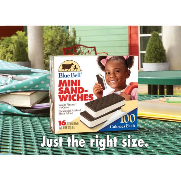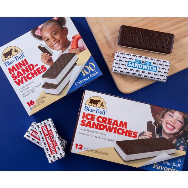 Blue Bell Mini Sandwiches are made with vanilla ice cream sandwiched between two delicious miniature chocolate wafers.