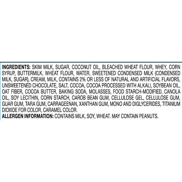 Buttermilk, Sugar, Coconut Oil, Whey, Bleached Wheat Flour, Corn Syrup, Wheat Flour, Water, Cream, Cocoa Processed With Alkali, Milk, Skim Milk, Contains 2% Or Less Of Cocoa, Unsweetened Chocolate, Cocoa Butter, Natural& Artificial Flavor, Canola Oil, Food Starch-modified, Soy Lecithin, Corn Starch, Salt, Soybean Oil, Oat Fiber, Carob Bean Gum, Cellulose Gum, Carrageenan, Mono& Diglycerides, Baking Soda, Vanilla Extract, Molasses, Caramel Color, Titanium Dioxide For Color.