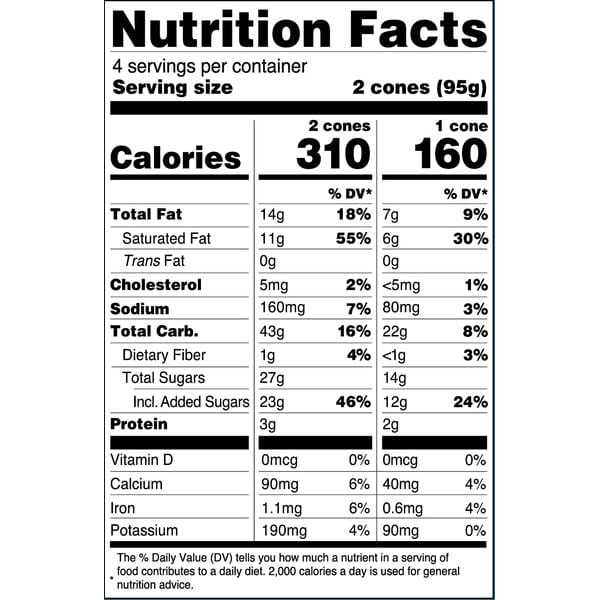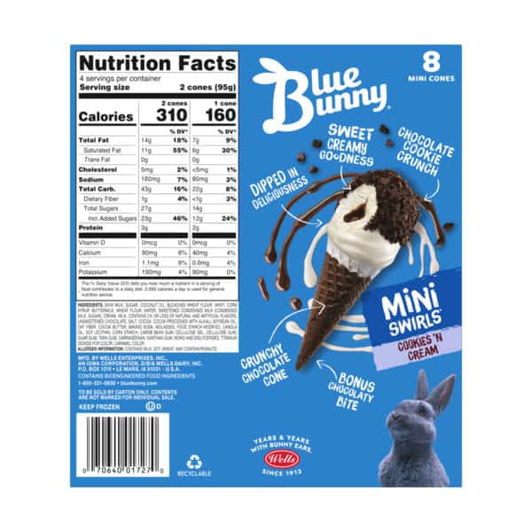 Seize the swirl with Blue Bunny Mini Swirls Cookies ‘N Cream Cones, the frozen treats that offer big flavor in a convenient snack-sized cone. A swirl of sweet cream flavored frozen dairy dessert with a chocolate fudge center gets dipped in a white confectionary coating that’s topped with chocolate cookie crunch pieces, all inside a chocolate sugar cone. The dipped swirly cue and bonus chocolaty bite at the bottom makes these sweet treats fun to eat from top to bottom. High-quality ingredients go into every batch of Blue Bunny, so grab life by the cone! Use Mini cones as frozen treats at backyard parties or as reasonable family desserts that the whole family can enjoy. You can even treat yourself and others to these sweet treats as a way to commemorate hitting personal milestones or for celebrating birthdays. These individually wrapped mini cones make it easy to stock up on frozen desserts. Try every single delicious, unique Blue Bunny frozen dessert, including Twist Cones, a new twist on classic soft serve ice cream cones. Blue Bunny–We Make Fun.