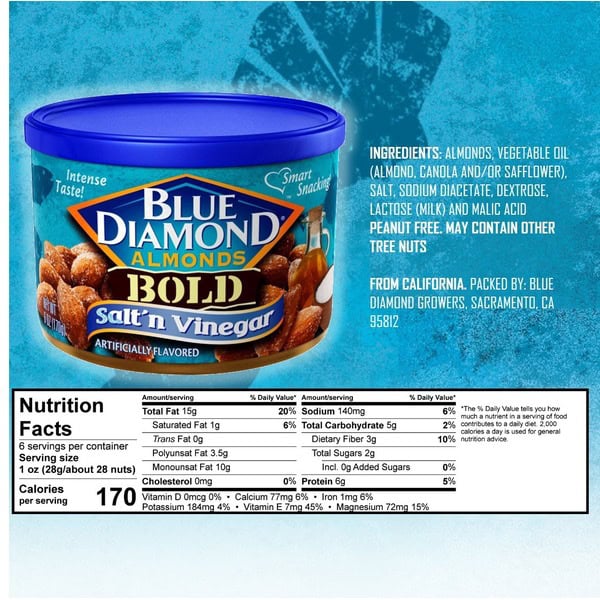 Almonds, Vegetable Oil (canola, Safflower And/or Sunflower), Salt, Sodium Diacetate, Dextrose, Lactose (milk) And Malic Acid.