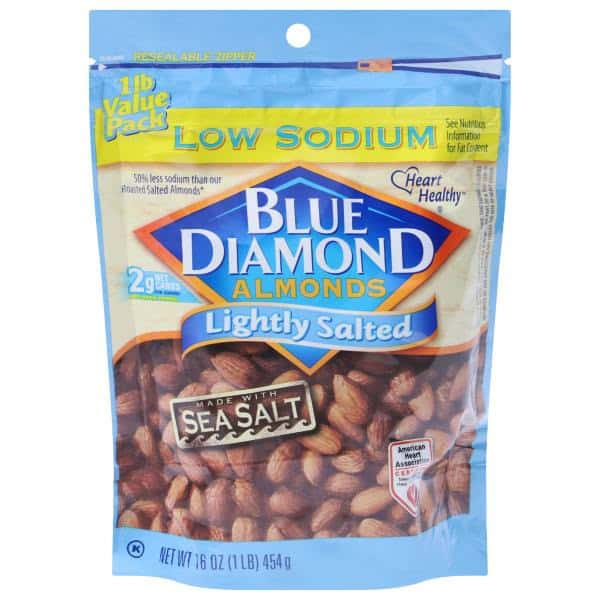 Blue Diamond Almonds® Lightly Salted. Made with sea salt. The finest quality almonds from orchards in the rich, fertile valleys of California. Low sodium and free from peanuts.