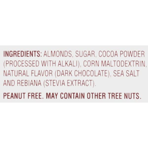 Almonds, Sugar, Cocoa Powder (processed With Alkali), Corn Maltodextrin, Natural Flavor (dark Chocolate), Sea Salt, Rebiana (stevia Extract)