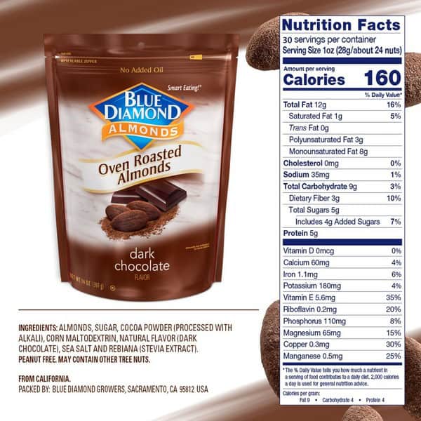 It’s not easy to turn off your chocolate cravings and give up sweets. Now you don’t have to. Our Dark Chocolate Oven-Roasted Almonds are covered in real cocoa powder and loaded with rich chocolate flavor, blended with just the right amount of sugar and naturally no-calorie stevia extract. By combining the creamy rich flavor of real dark chocolate with our almonds, packed with nutrition and naturally loaded with vitamin E, we turned a tough challenge into a delicious snack you can enjoy every day.