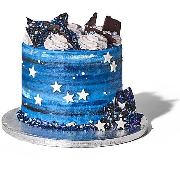 Six layers of vanilla or chocolate cake iced and filled with cosmic blue and blue-gray buttercream and decorated in chocolate shards and sugar paste stars. This cake may be filled with cosmic fusion sprinkles. . Order your cake today!
