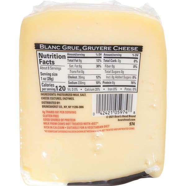 Prepared in copper vats and aged in the traditional Alpine manner, this earthy, aromatic cheese has a firm texture and lush flavor with just a hint of cashew. Boar’s Head® Blanc Grue® Gruyere Cheese is made with milk from small family farms in Wisconsin.