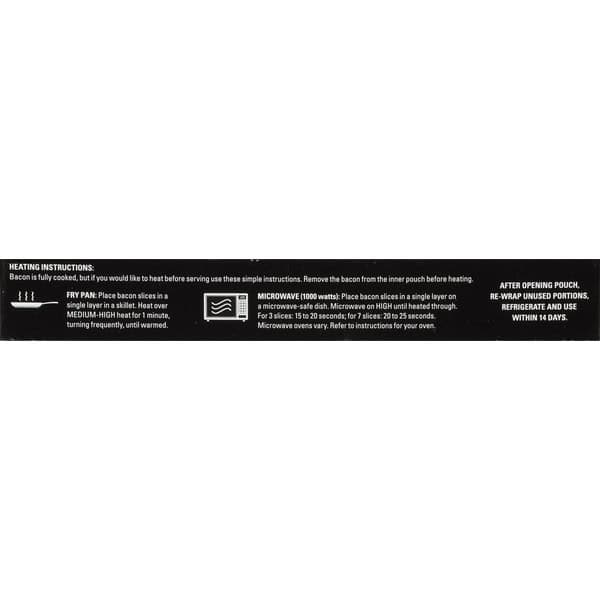 Heating instructions: Bacon is fully cooked, but if you would like to heat before serving use these simple instructions. Remove the bacon from the inner pouch before heating. Fry pan: Place bacon slices in a single layer in a skillet. Heat over medium-high heat for 1 minute, turning frequently, until warmed. Microwave (1000 watts): Place bacon slices in a single layer on a microwave-safe dish. Microwave on High until heated through. For 3 slices: 15 to 20 seconds; for 7 slices: 20-25 minutes. Microwave ovens vary. Refer to instructions for your oven.