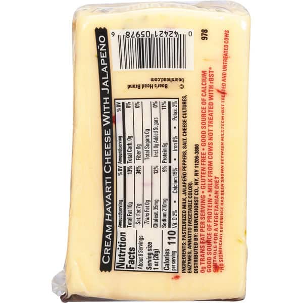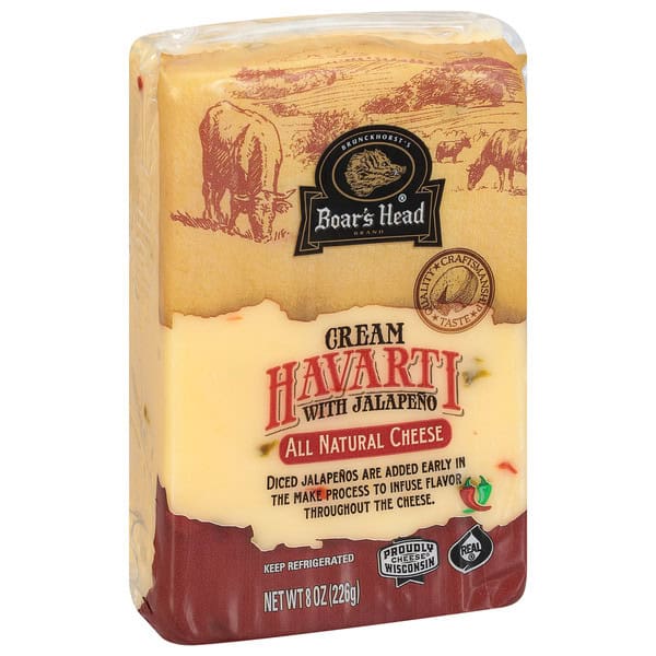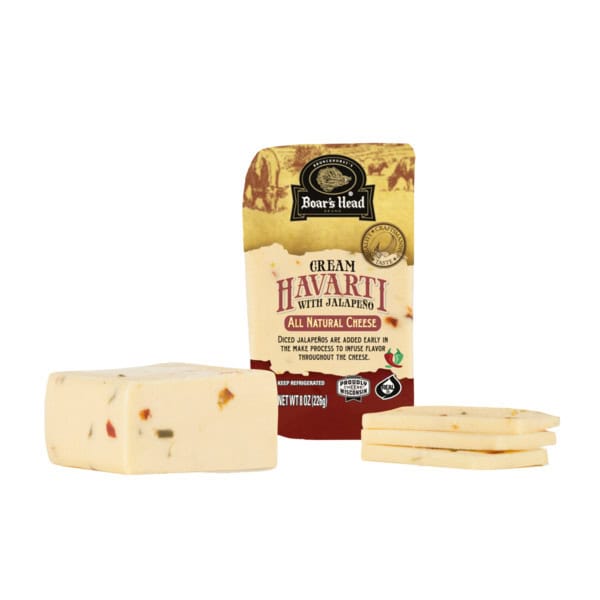 A double crème classic made in the traditional Danish style. Boar’s Head® Cream Havarti with Jalapeño is a Wisconsin-made cheese that is blended with zesty jalapeno peppers to give this rich buttery cheese a spicy finish.