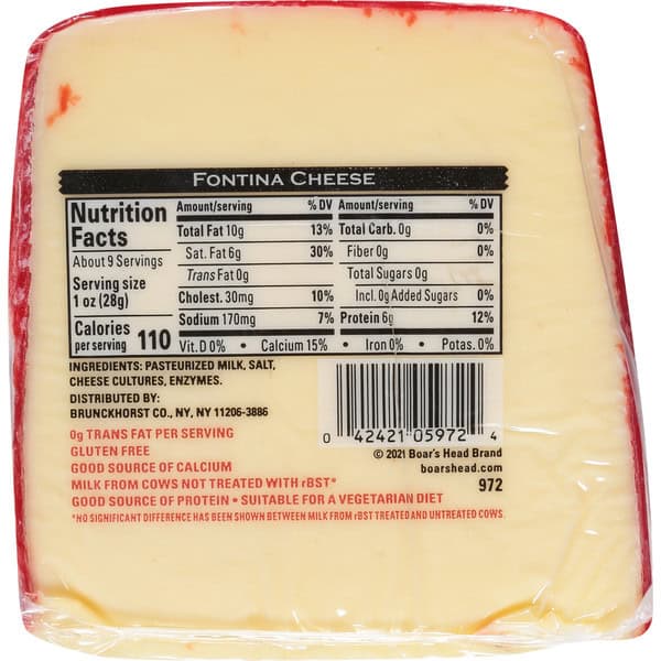 Inspired by Swedish artisans who adopted a cheese-making style that originated in the Italian Alps, this cheese has a rich, mellow flavor with subtle nutty and tart notes. Boar’s Head® Fontina Cheese is crafted with care to produce a distinctly creamy, smooth texture.