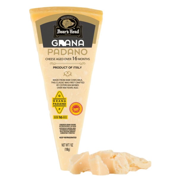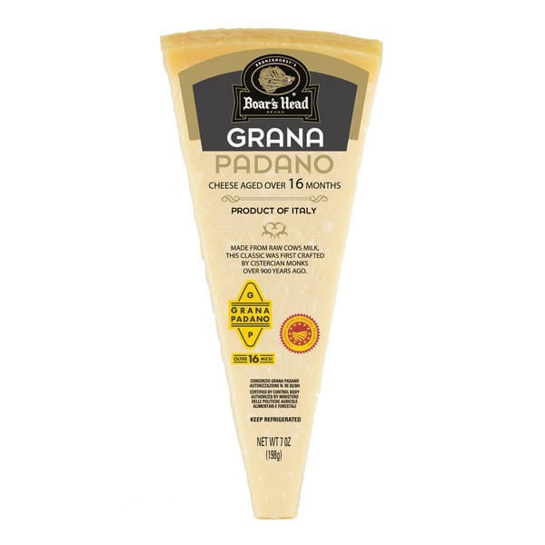 Mild with subtle sweetness, this cheese is crafted with raw cow’s milk in Italy using techniques inspired by the Cistercian monks who invented it centuries ago. Boar’s Head® Grana Padano Cheese is aged for more than 16 months to produce an extra-hard, flavorful cheese with a fine, granular texture.