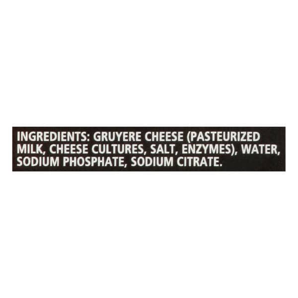 Gruyere Cheese (pasteurized Milk, Cheese Cultures, Salt, Enzymes), Water, Sodium Phosphate, Sodium Citrate